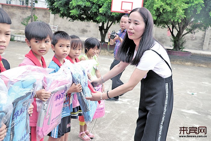 章女士给学生赠送书包和生活补助。