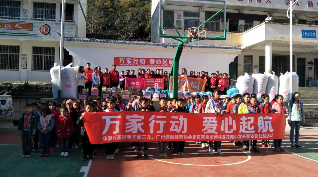 万家行动,爱心起航。2019年12月16日至17日,华润万家携手三九医药、广州连锁经营协会的企业代表组成爱心小组,用自己的行动默默关爱广西西林县那佐乡龙滩小学的贫困孤儿、学子和贫困户,送去了大批物资,让那里的孩子们真正得到帮助和关爱。