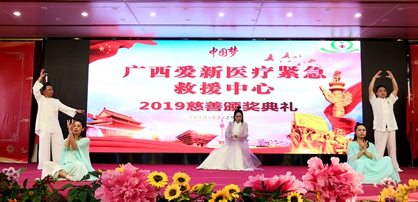 12月29日,在南宁高新区地凯育仁幼儿学校礼堂内鲜花簇拥,彩旗飘扬,胜利的欢呼声彼此起伏,开场电声乐队表演《红旗飘飘》将广西爱新医疗紧急救援服务中心2019年度慈善颁奖典礼拉开了序幕。