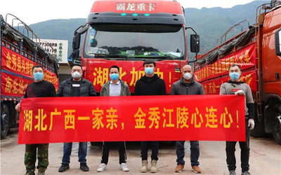 当天下午,在来宾市金秀瑶族自治县头排镇八零果业门前,3辆大卡车整装待发,满载着一箱箱捐赠给湖北疫区的爱心沙糖桔,每辆车的车头都贴着“湖北加油”几个醒目的字。