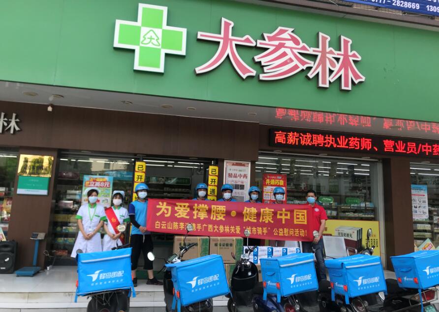4月29日,白云山陈李济携手大参林在广西举办“为爱撑腰·健康中国”关爱城市骑手公益慰问活动,希望通过实实在在的行动,来传递爱心,让骑手在疫情期间感受到温暖的关怀。同时,也希望通过此次活动能加强外卖骑手的内心归属感、职业荣誉感和社会认同感。