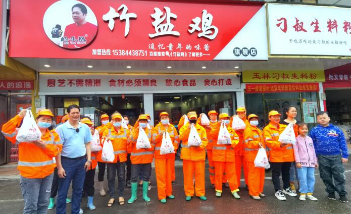 “五一”劳动节当天,位于南宁市中尧路上的“岭头凰.竹盐鸡”旗舰店老板朱世才先生,向中尧路地段正在工作的30多位环卫工人,每人赠送一只竹盐鸡,向他们致以节日的问候。