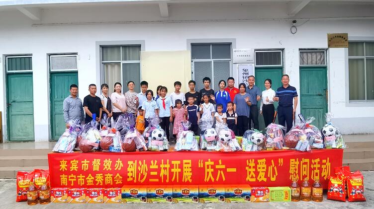 2022年5月30日,来宾市督效办联合南宁金秀商会到帮扶村——来宾市象州县象州镇沙兰村开展了“庆六一 送爱心”慰问活动,为孩子们送去了书包、篮球、足球、羽毛球、乒乓球、学习文具、水杯等爱心礼物,并送上“六一儿童节快乐”的节日祝福,随后,南宁市金秀商会还认购了沙兰村集体经济特产木耳160斤,拓宽集体经济产业销路,助推产业振兴。