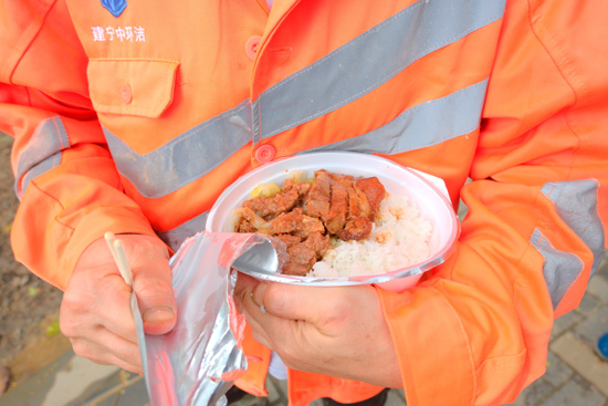 数百份竹盐鸡,搭配着莫氏香芋扣肉排骨,还有清爽可口的紫菜蛋花汤、解渴的矿泉水以及各式各样的饮料,每人一份,环卫工人们吃得津津有味,脸上洋溢着满足与幸福的笑容!