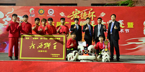 最终,贺州市胡氏真武龙狮团凭借精准的南狮动作把控与深厚的狮舞艺术底蕴,斩获第十五届广西狮王争霸赛金奖,登上“广西狮王”称号宝座。广西龙狮运动协会主席潘慧斌表示,协会成立十五年来,在自治区体育局和各市县体育部门的鼎力支持下,在各市县龙狮运动协会和龙狮团队的支持与配合下,狮王争霸赛已成为展现广西龙狮运动发展水平的核心平台,也是广西龙狮运动每年年度最高荣誉奖项,累计吸引超 400 支队伍、上万名运动员参与,推动广西龙狮从民间民俗走向专业化、品牌化发展道路,更培育出一批在国内外赛事中屡获殊荣的顶尖队伍。