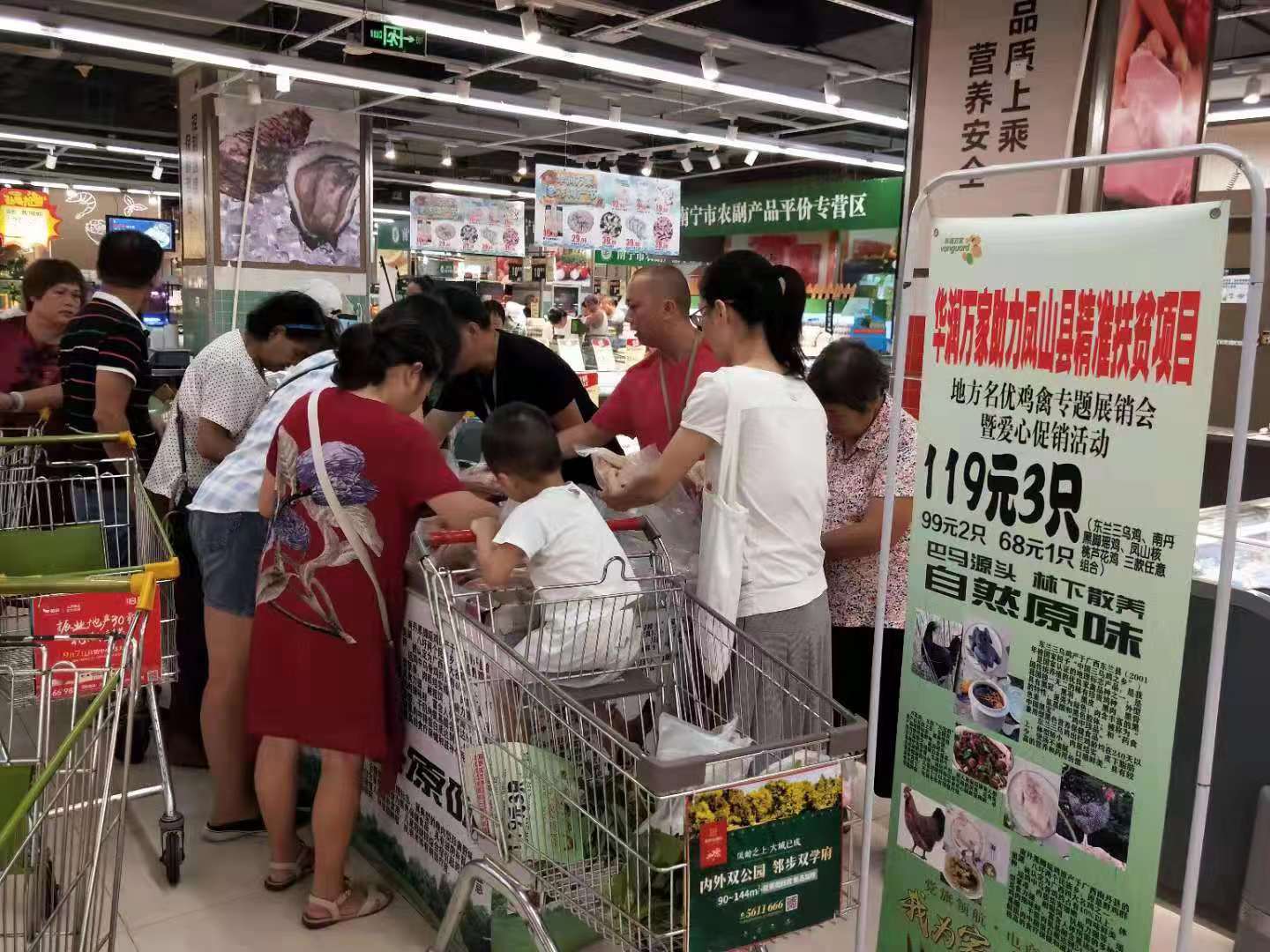 据了解,这些从凤山县的林下养殖基地上走进城市的鸡禽通过华润万家供应商伙伴广西润桦昌贸易公司使用先进技术设备和微冷冻技术加工包装后,全程冷链物流配送直接运到广西华润万家超市门店。无抗生素、无药残、无寄生虫、富含牛黄酸、氨基酸、蛋白质、微量元素的绿色营养土鸡,还很新鲜,市民都很喜欢。目前,华润万家在广西南宁东葛店设立了润桦昌凤山县消费扶贫家禽销售专区,计划逐步覆盖广西南宁、百色门店,以广西为轴心面向全国门店,通过消费扶贫模式,销售凤山县贫困户养殖的家禽,加快助推凤山县贫困人口增收脱贫的步伐。